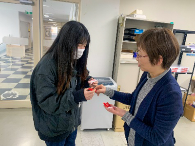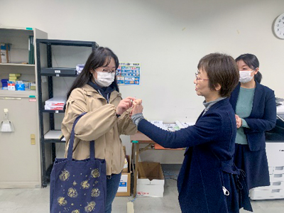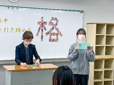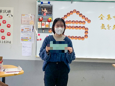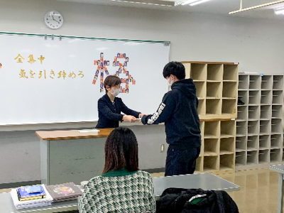 試験を目前に控え、緊張感Maxの学生1人ひとりに受験票を二本柳先生から渡しました。
